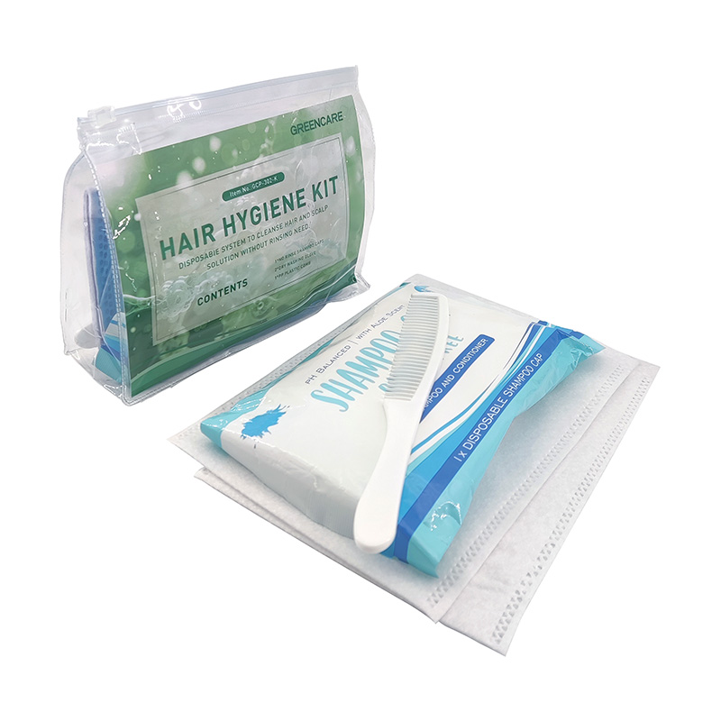 PARTS: 1 × No rinse shampoo caps 2 × Dry washing glove 1 × PP plastic combPACKAGE: one set /zipper bag.24 kits/carton box.